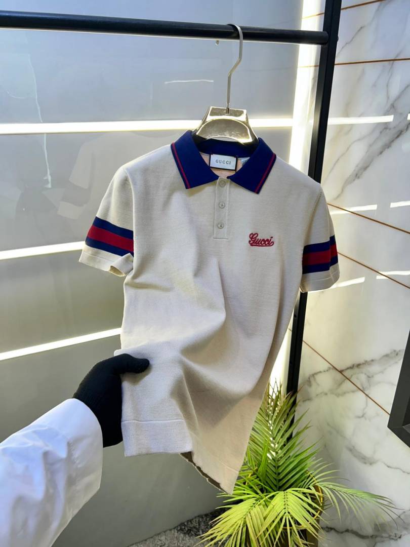 Gucc i White Imported knitted Premium Collar Neck Polo T-shirt F3557-WH